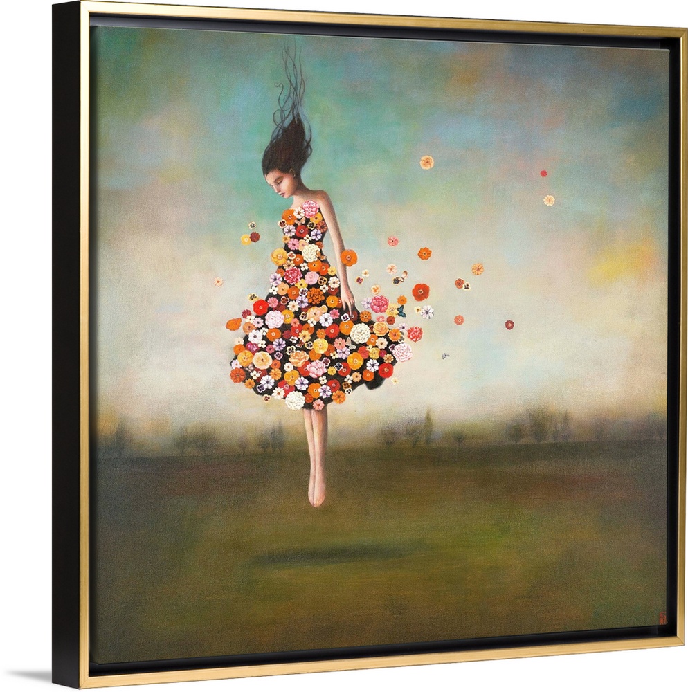 <p>Contemporary surreal artwork of a woman wearing a dress made of flowers floating in the air.</p>