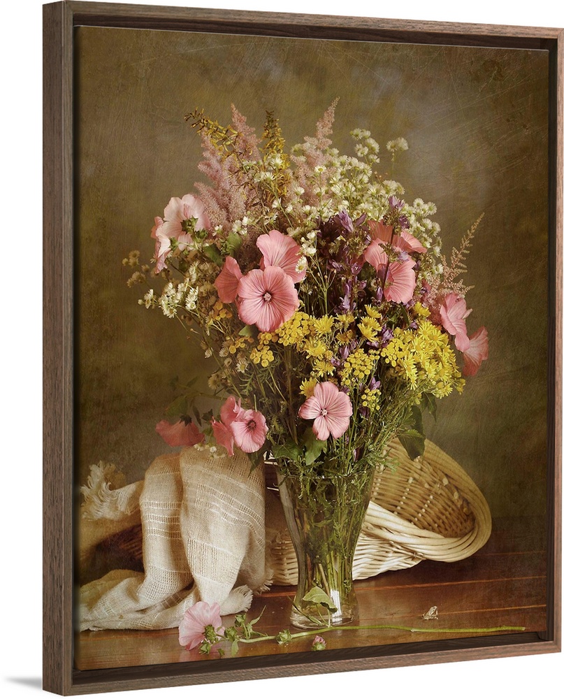 <p>Lavatera and wild flowers in glass vase with basket with drapery in background.</p>