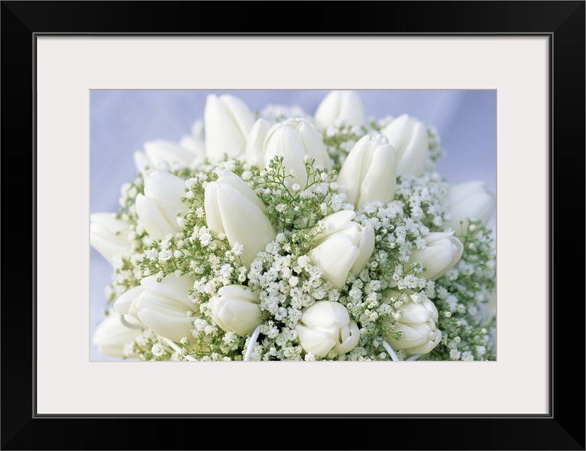 <p>Close up picture of a bouquet of closed white tulips and baby's' breath.</p>