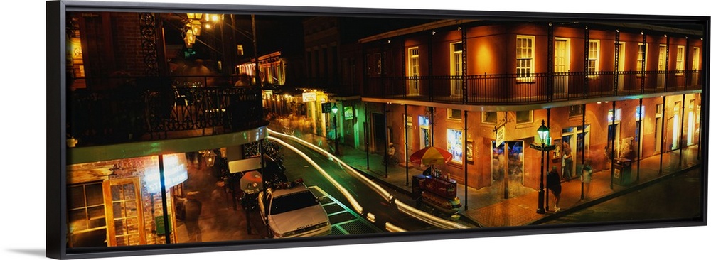 <p>Panoramic photograph displays a nighttime view of the busy streets within the French Quarter located in a famous Southeastern United States city. Photographer uses a slow shutter speed to get the effect of fast moving lights in the picture.</p>
