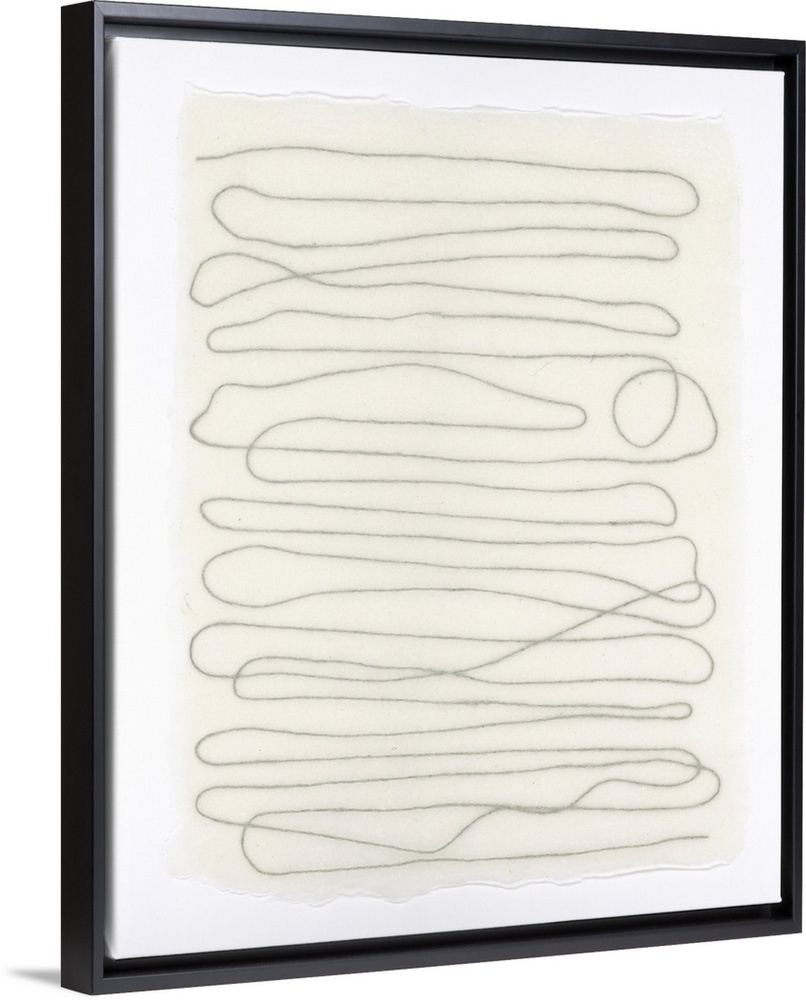 <p>Gray linen thread winds along a twisting path suspended in handmade paper.</p>