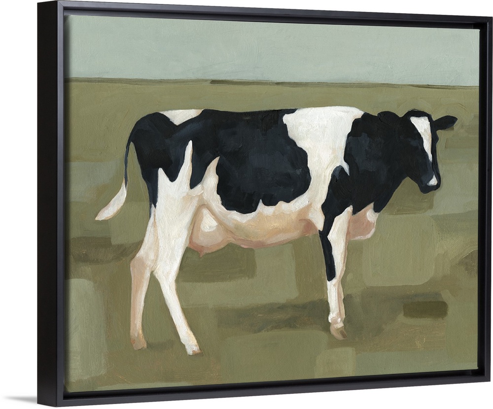 <p>Contemporary painting of a black and white cow standing in a field of spotted shades of green.</p>