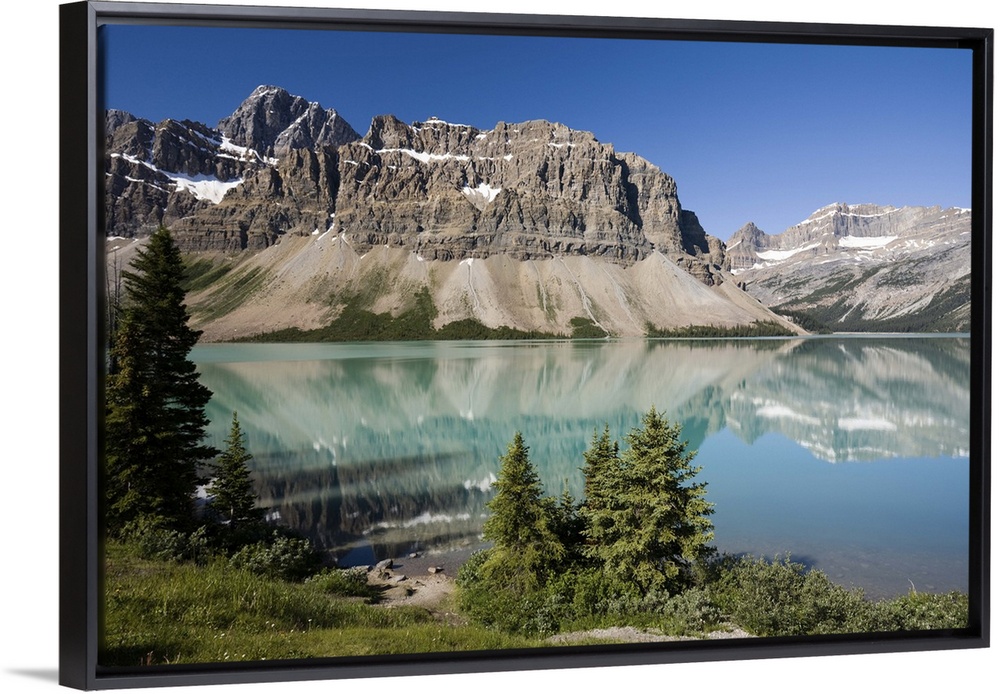 <p>Canadian Rocky Mountains reflected in Bow Lake, a popular scenic stop on the Icefields Parkway in Banff National Park, Alberta, Canada</p>