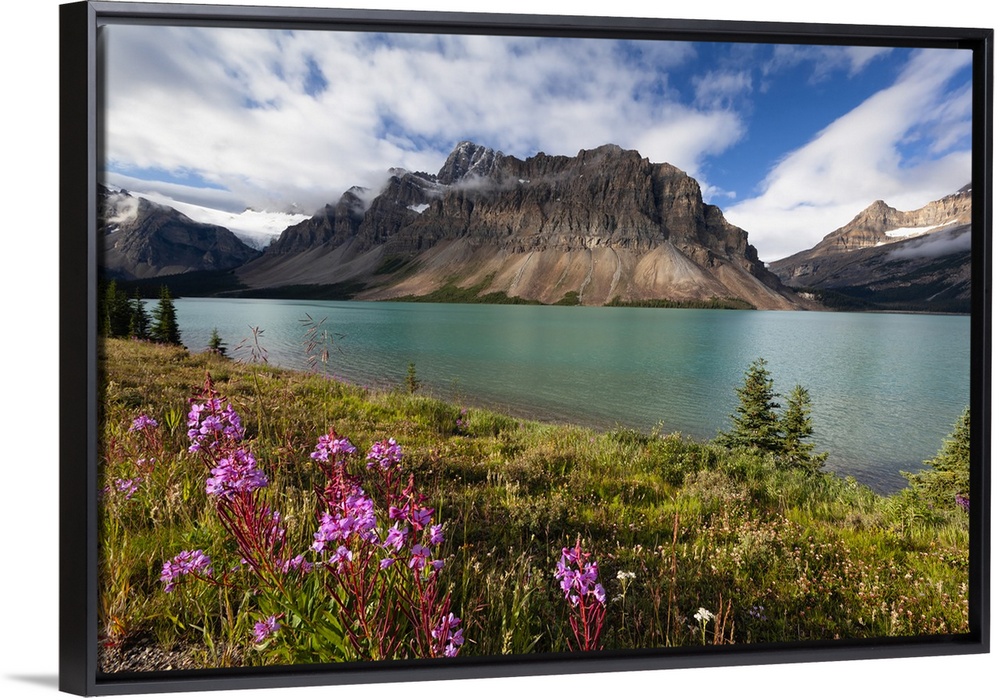<p>Bow Lake with the Crowfoot Mountain and Red Wildflowers, Banff National Park, Alberta, Canada</p>