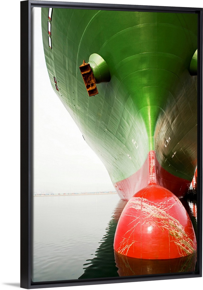 <p>Bow of a red and green cargo ship.</p>
