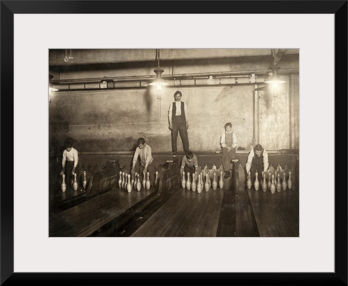 <p>Pin boys working with a supervisor in the Subway Bowling Alleys in Brooklyn, New York. Photograph by Lewis Hine, April 1910.</p>