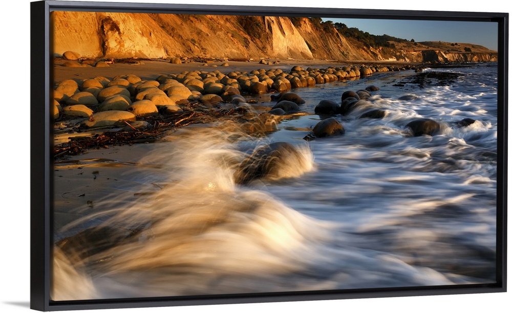 <p>Warm sunset light paints wave splash and large round rocks at zero tide, Bowling Ball Beach, Northern California Coast, California, USA. This beach is located 10 miles south of Point Arenas, California.</p>