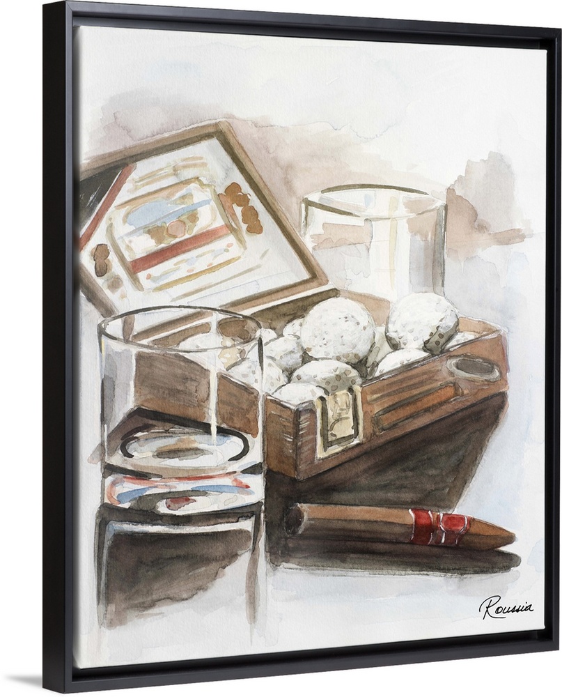 <p>Painting of a box of golf balls with glasses and a cigar.</p>