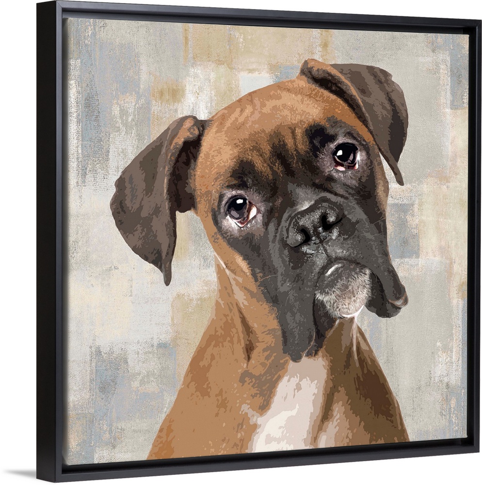 <p>Square decor with a portrait of a Boxer on a layered gray, blue, and tan background.</p>