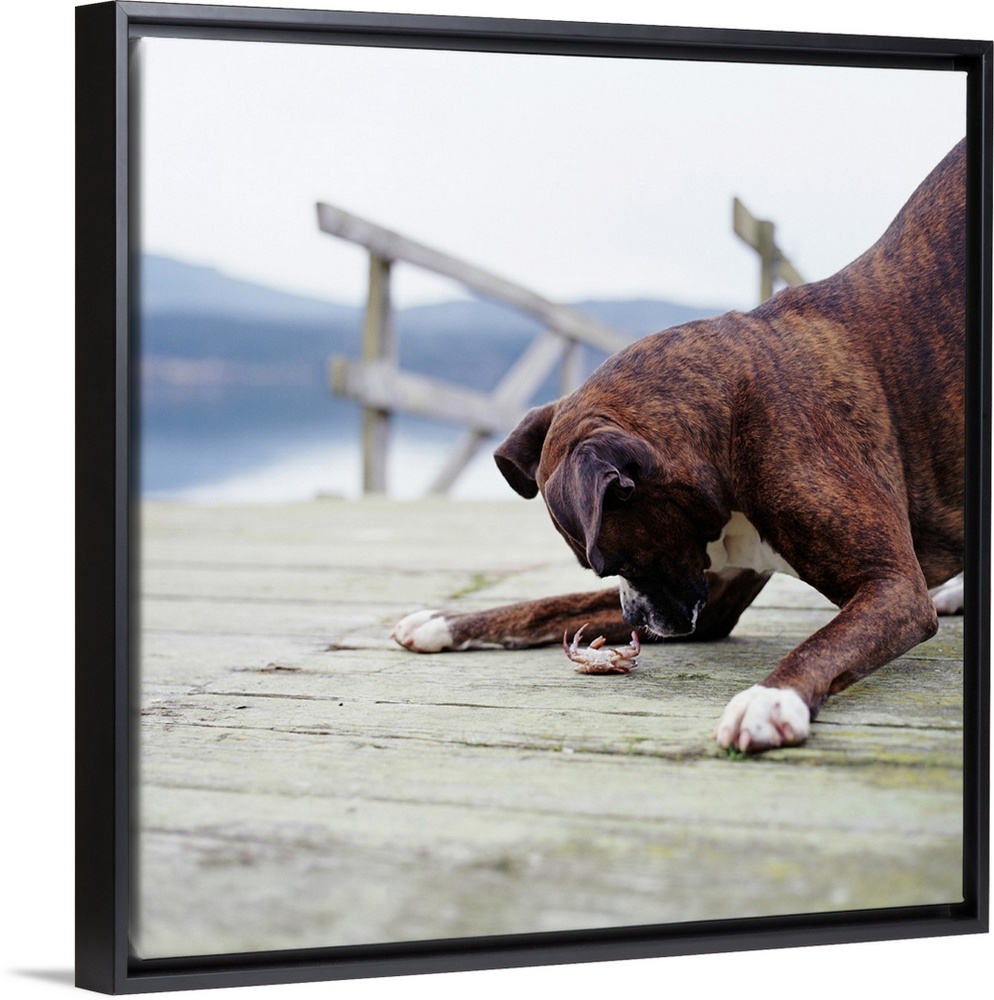 <p>Boxer dog playing with crab on pier</p>