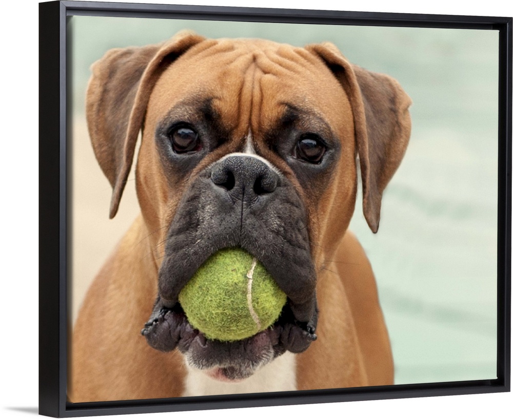 <p>Boxer dog holding tennis ball in mouth.</p>