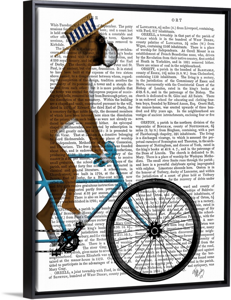 <p>Decorative artwork of a Boxer wearing a hat and riding a bicycle, painted on the page of a book.</p>