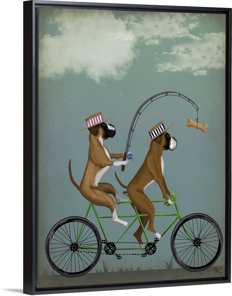 <p>Decorative artwork of two boxers wearing hats riding on a green tandem bicycle with the dog in the back holding a fishing rod over the dog in the front with a bone dangling.</p>