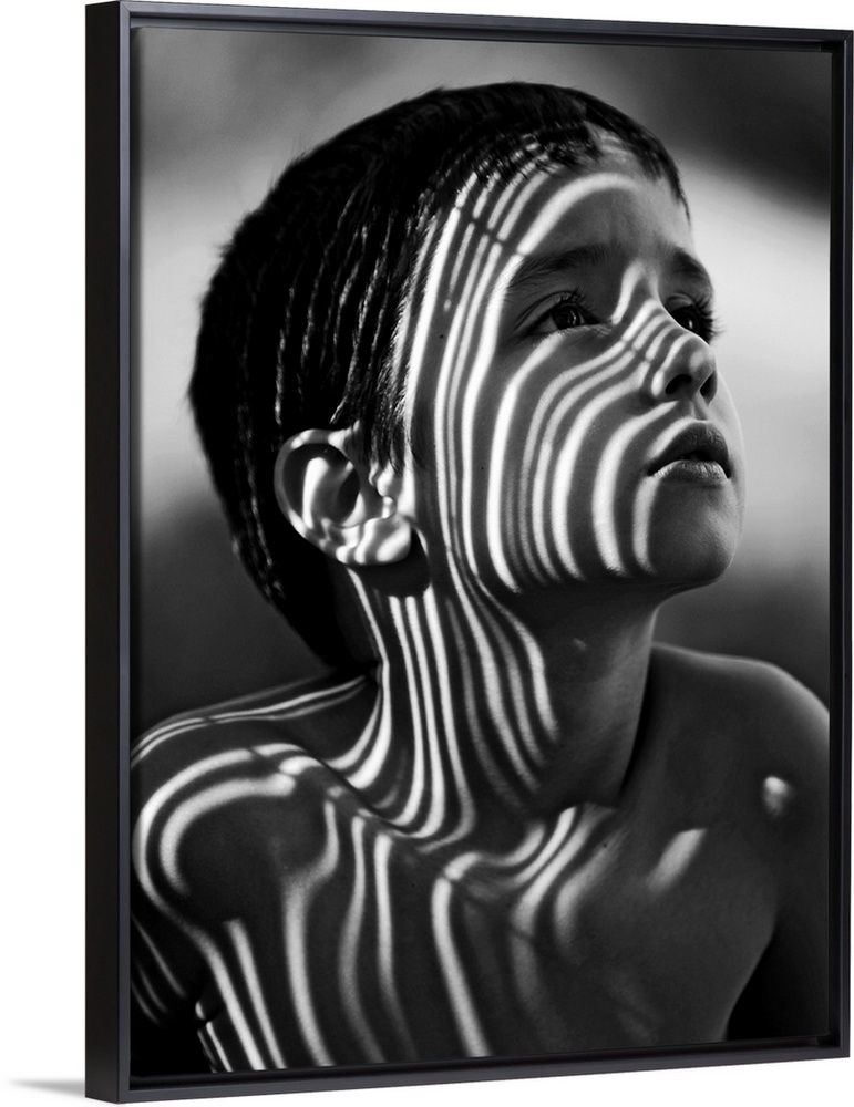 <p>Portrait of a young boy with striped shadows across his face.</p>