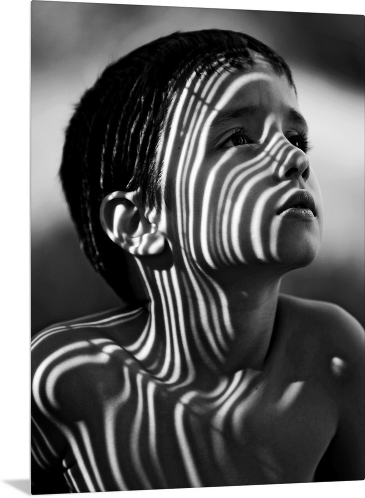 <p>Portrait of a young boy with striped shadows across his face.</p>