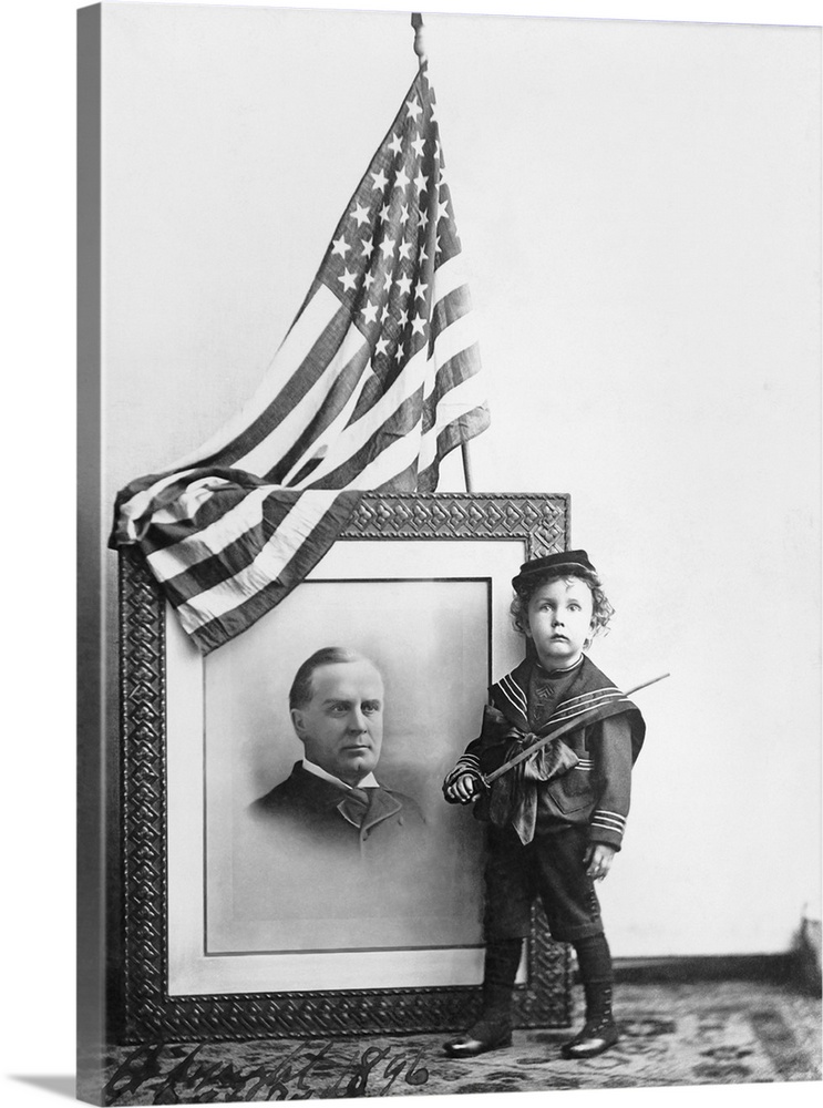 <p>Boy in sailor uniform holding sword in front of flag-draped portrait of William McKinley, circa 1896.</p>