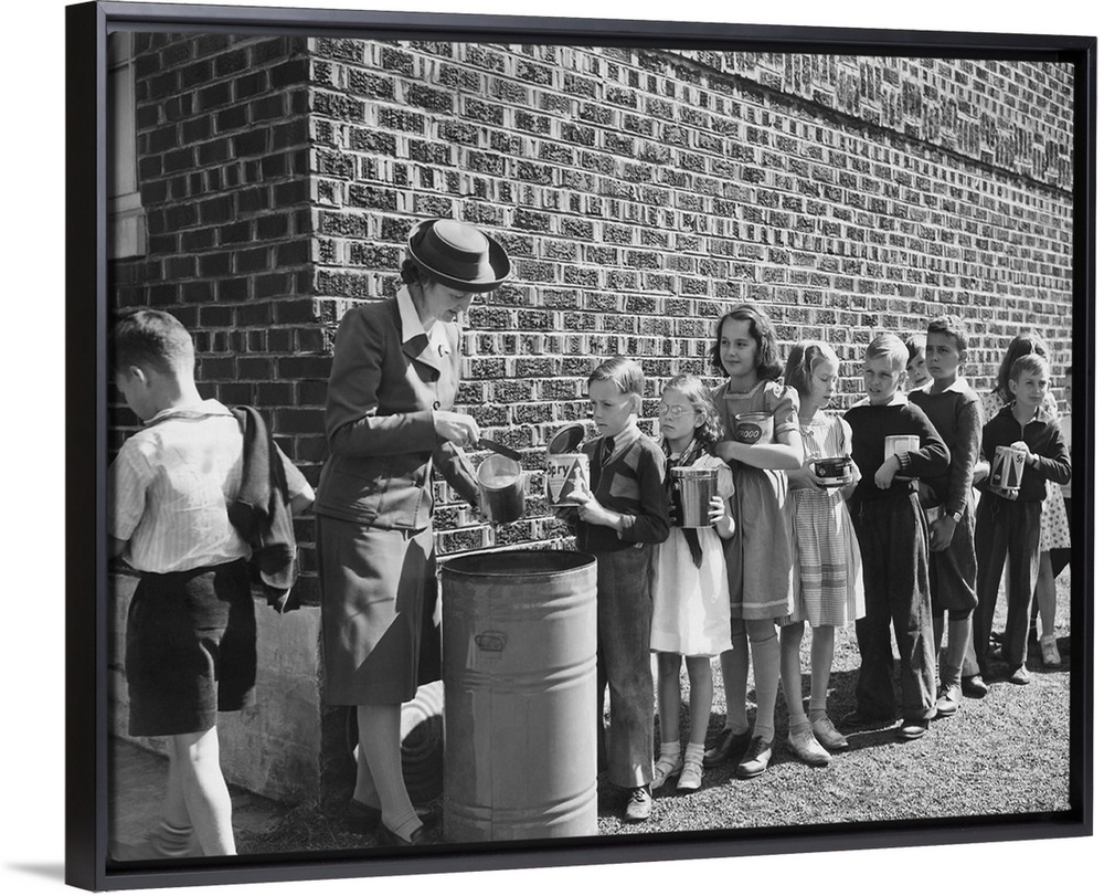 <p>Boys and girls collect fats and greases then turn it over to school authorities, circa 1942</p>