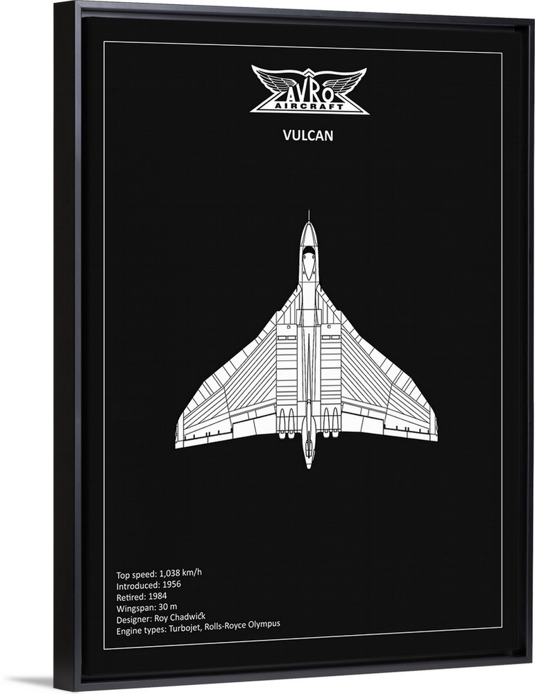 <p>Black and white diagram of a BP Avro Vulcan with written information at the bottom, on a black background.</p>