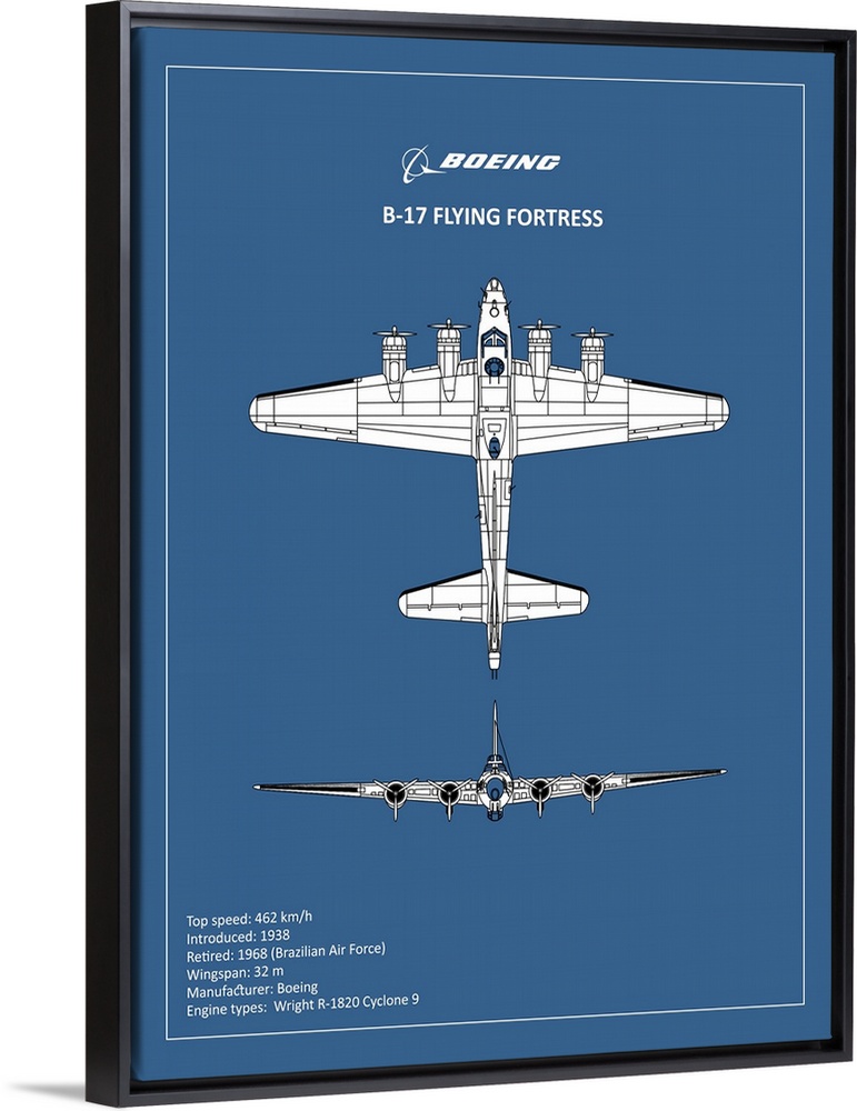 <p>Black and white diagram of a BP B17 FlyingFortress with written information at the bottom, on a blue background.</p>