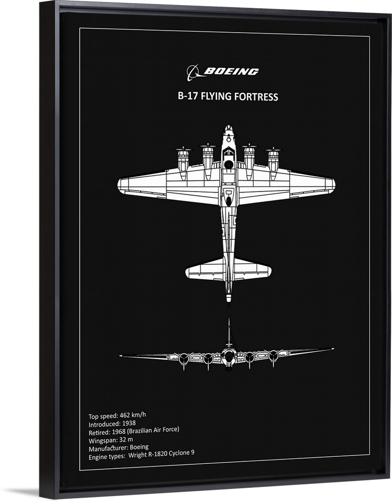 <p>Black and white diagram of a BP B17 FlyingFortress with written information at the bottom, on a black background.</p>