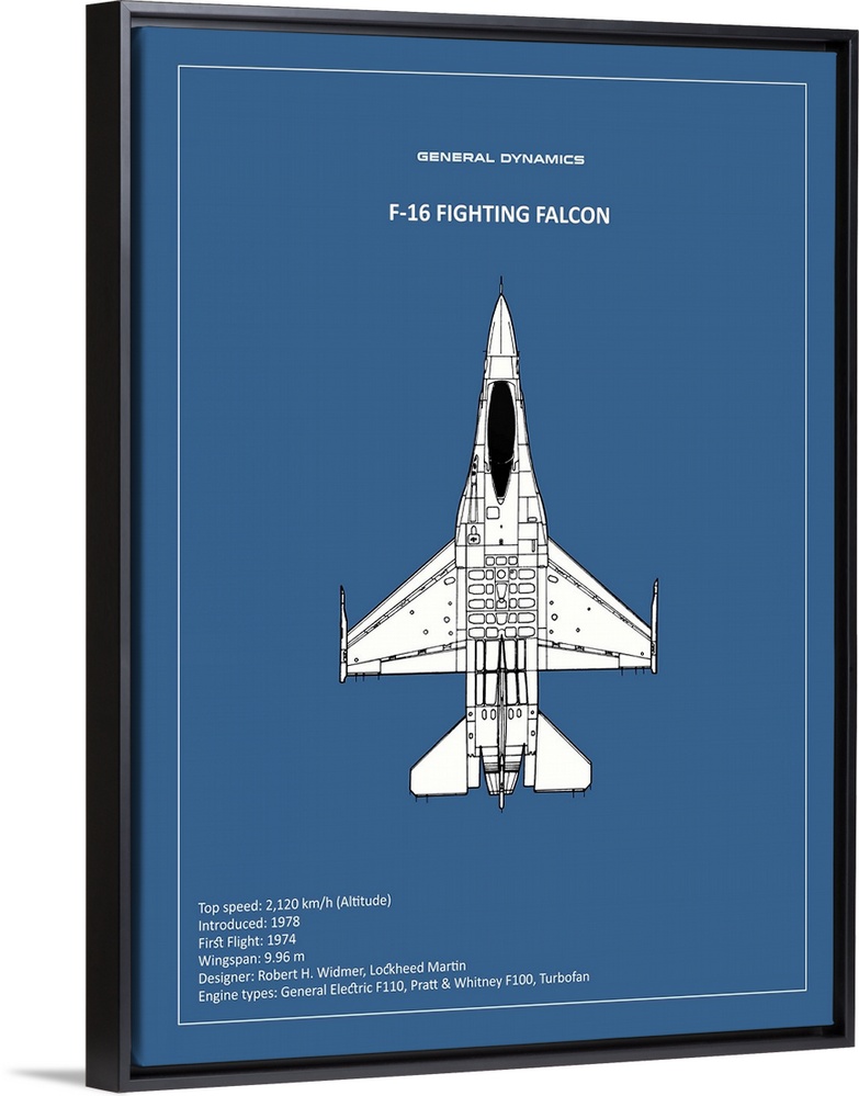 <p>Black and white diagram of a BP F-16 Fighting Falcon with written information at the bottom, on a blue background.</p>