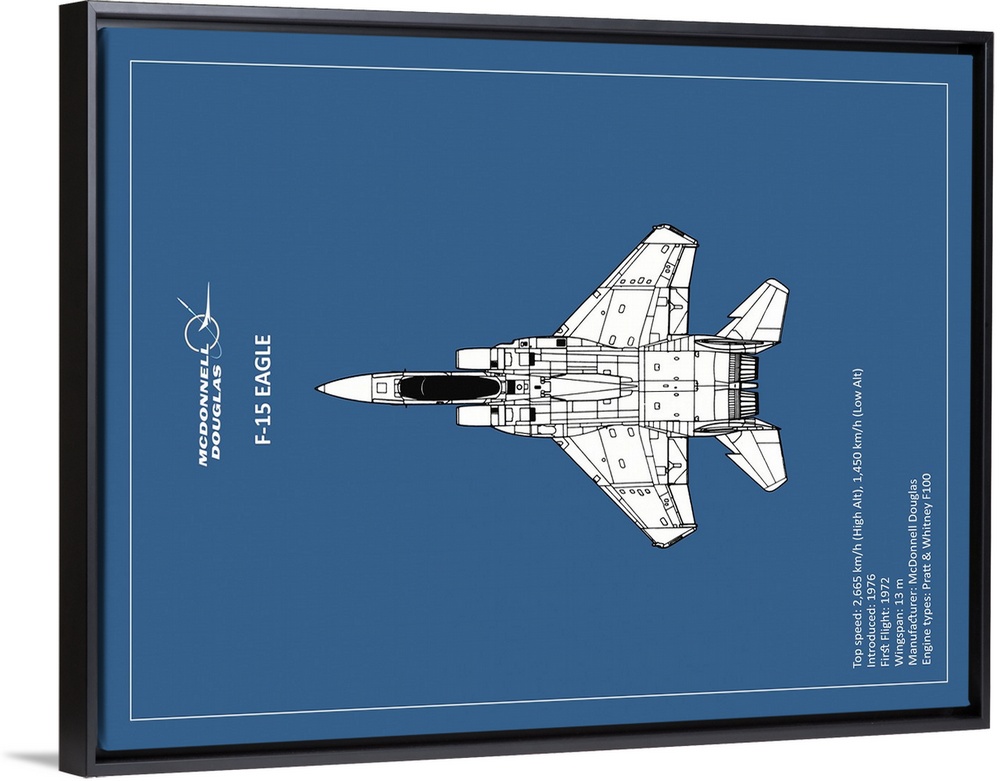 <p>Black and white diagram of a BP F15 Eagle with written information at the bottom, on a blue background.</p>