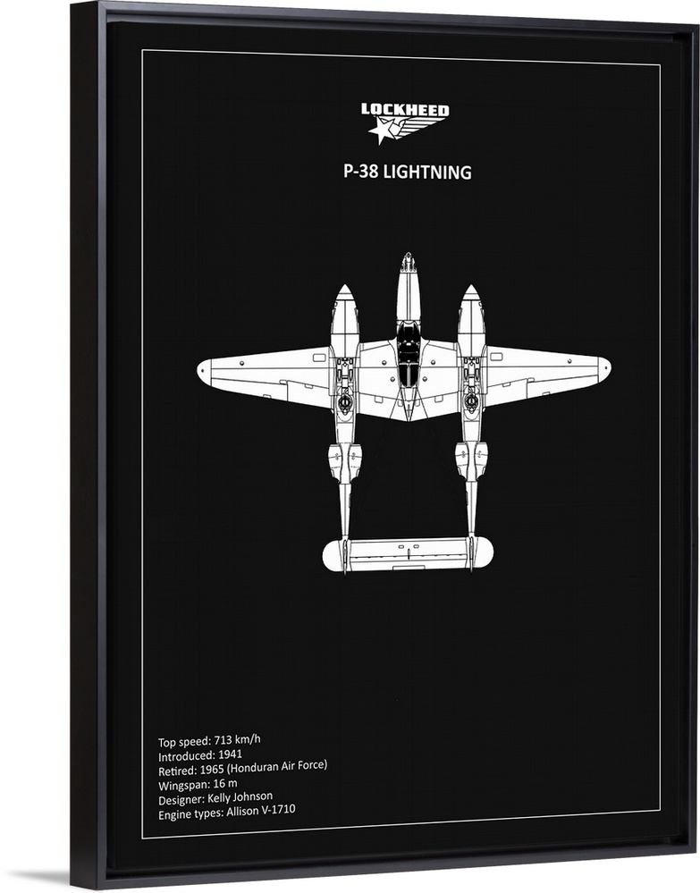 <p>Black and white diagram of a BP Lockheed P38 Lightning with written information at the bottom, on a black background.</p>
