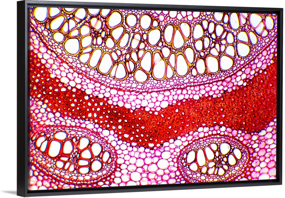 <p>Bracken rhizome. Light micrograph of part of a cross-section through a rhizome from the bracken Pteridium aquilinum. The centre of the rhizome is off top, while the outer surface is off bottom. Two small vascular strands (meristeles, round) are at lower right and lower left, with a larger one half-seen across top. A band of supporting fibres (red) is also seen. Each meristele consists of central xylem vessels (large, white), surrounded by successive areas of phloem, pericycle and endodermis.</p>