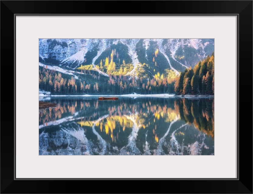 <p>Braies Lake With Beautiful Reflection In Water At Sunrise In Autumn, Dolomites, Italy</p>