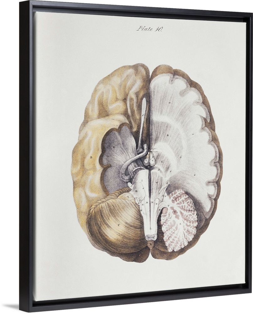 <p>Brain anatomy. Historical anatomical artwork of internal brain structures. The brain is seen from below, with the front of the brain at top. One of the hemispheres of the brain is intact (left), and the other half has been dissected (right). This is done to show the connections between three main parts of the brain. The most primitive part, the brainstem (white, lower centre) connects to the spinal cord (not seen). Branching out from the brainstem are connections to the cerebellum (lower right and left) and the cerebrum (upper right and left). The cerebrum produces conscious thought and memory. Artwork from The Nerves of the Human Body (Ed. Jones Quain, 1839).</p>