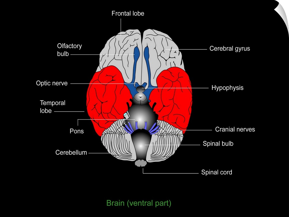 <p>Brain anatomy. Diagram of the underside (ventral aspect) of the brain, showing the anatomical structure of the various components. At the rear of the brain is the cerebellum (grey with black lines), split between the two hemispheres of the brain. Also split between the hemispheres are the temporal lobes (red), and the frontal lobes (top). The folds in the lobes are called gyri. Descending from the frontal part of the brain are the olfactory bulbs and optic nerves (blue, top). Also blue, but lower down, are the cranial nerves. The darker grey areas down centre are (top to bottom) the hypophysis, the pons, and the spinal bulb. Right at bottom is the spinal cord.</p>
