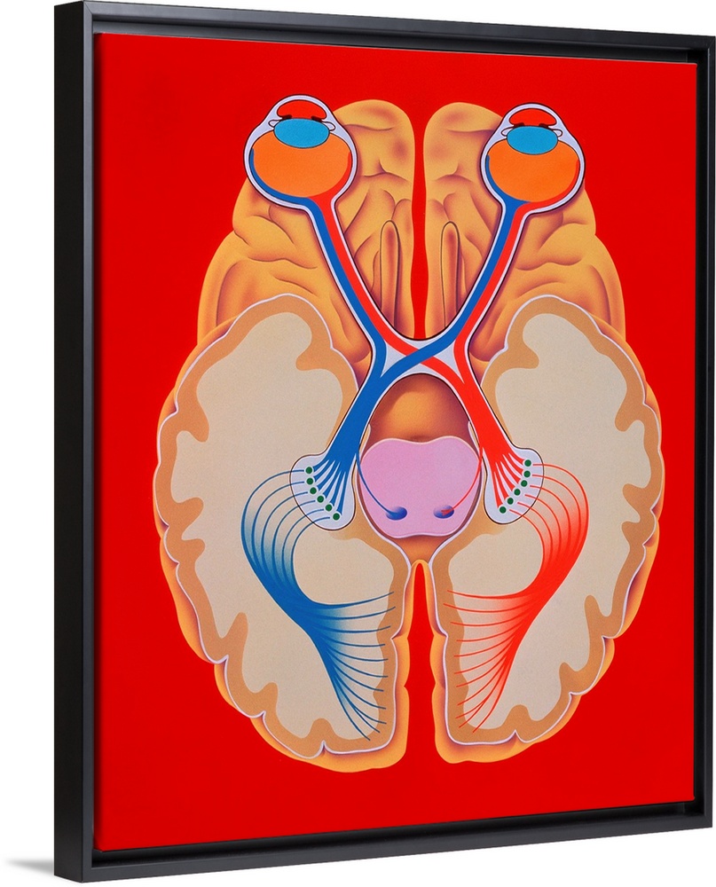 <p>Illustration of visual pathways from the retina of the eye to the brain cortex (seen from below). At the back of each eye (at top), the light-sensitive membrane of the retina transforms visual images into nerve impulses. These images are binocular in that the visual field of each eye overlaps. Each eye has a unique field of view too, which is also analysed by the brain. Light that falls on the right side of each retina (blue) from the left field of view, passes as impulses to the right visual cortex of the brain via the optic nerves at centre, and chiasma (cross-point of these nerves). This is reversed for light that falls on the left side of the retina (coloured red).</p>