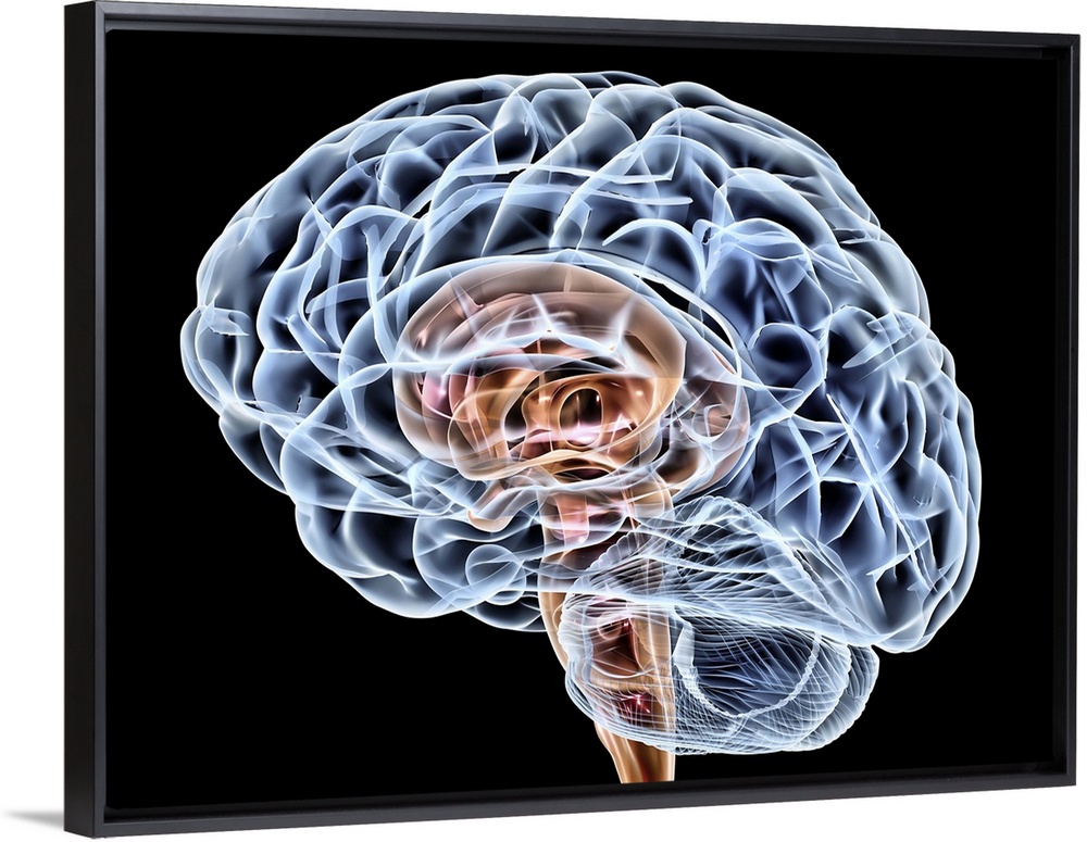 <p>Brain. Computer artwork of a side view of a healthy male brain. The front of the brain is at left. The highly folded area is the cerebrum, which is responsible for conscious thought, emotion and voluntary movement. The striped structure at lower right is the cerebellum, which controls voluntary muscular movement and maintains posture and balance. The corpus callosum (tissue connecting the two hemispheres) and brainstem are brown. The brainstem controls subconscious functions such as breathing and the regulation of heart rate, and connects the brain to the spinal cord (bottom).</p>