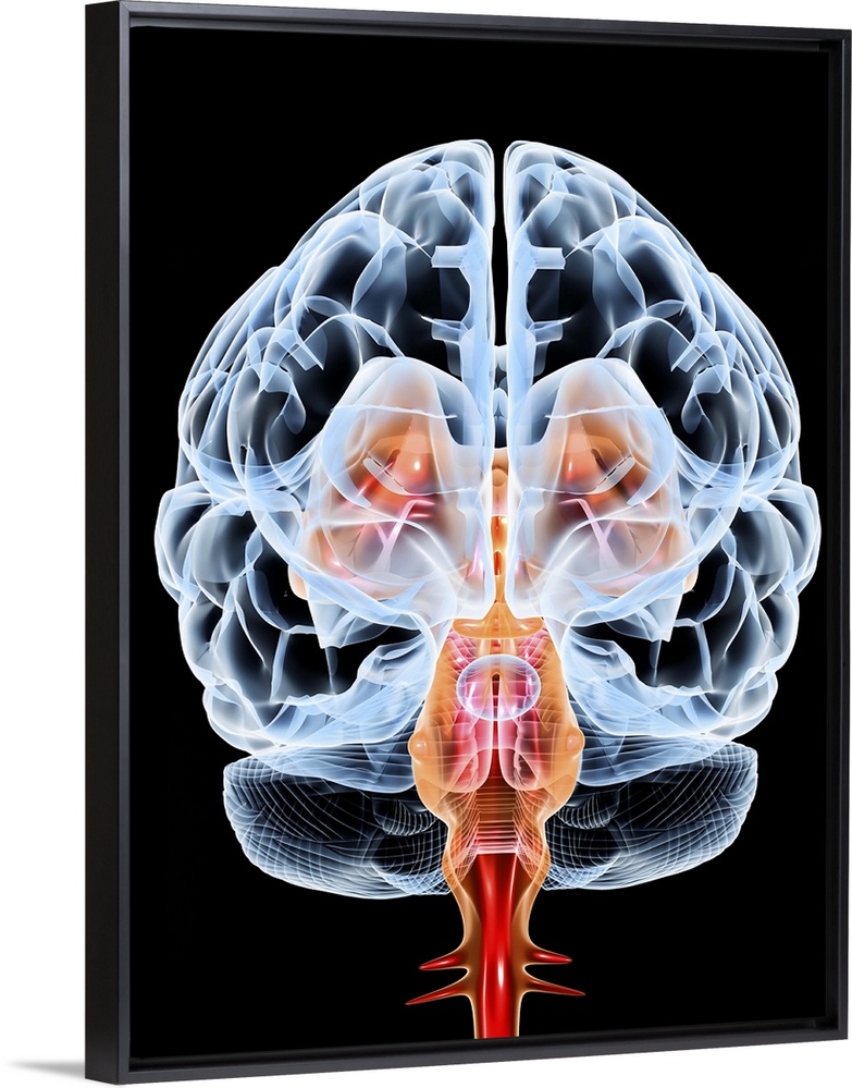<p>Brain. Computer artwork of a frontal view of a healthy male brain. The front of the brain is at left. The highly folded area is the cerebrum, which is responsible for conscious thought, emotion and voluntary movement. The striped structure at lower right is the cerebellum, which controls voluntary muscular movement and maintains posture and balance. The corpus callosum (tissue connecting the two hemispheres) and brainstem are brown. The brainstem controls subconscious functions such as breathing and the regulation of heart rate, and connects the brain to the spinal cord (bottom, red).</p>