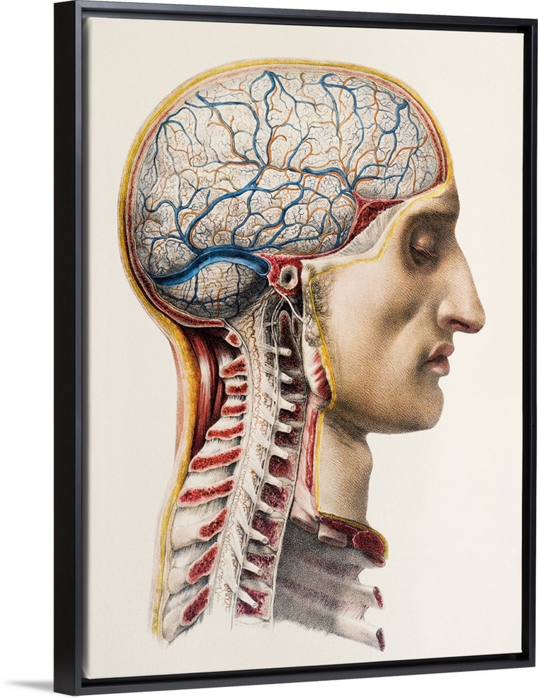 <p>Brain blood vessels. Historical anatomical artwork of the blood vessels of the human brain. This view is from the side. Part of the skin and skull and the outer membrane covering the brain (the dura mater) has been removed, showing the blood vessels running over the surface of the brain. Veins are blue and arteries are orange. The ear hole is seen, and in the neck at lower left the spine has been dissected in half lengthwise. Artwork from the 19th-century book Atlas of Anatomy, by Bourgery and Jacob. This book, which took over 20 years to complete, was published in France in 8 volumes from 1831 to 1854. It contained 726 colour plates covering both anatomy and surgical techniques.</p>