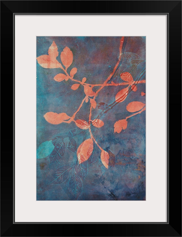 <p>A stunning contemporary cyanotype image featruing coral colored branches against a blue and rust colored background</p>
