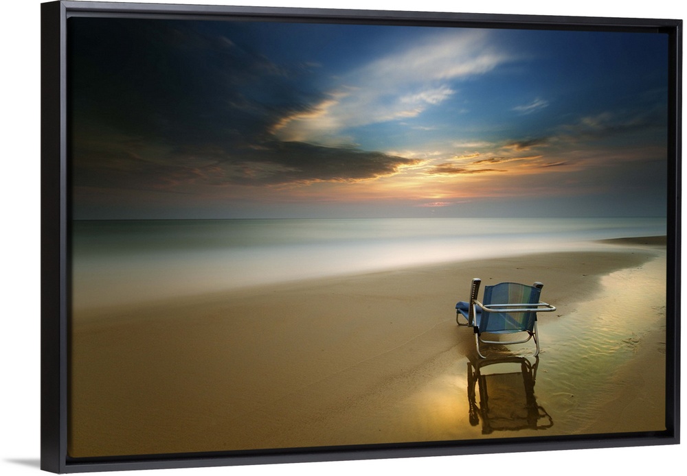 <p>Long exposure seascape photograph of a beach chair on the shore during sunset.</p>