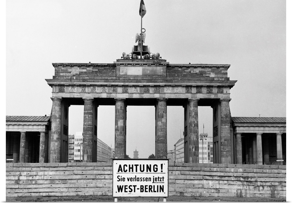 <p>The Brandenburg Gate in East Berlin. In front, a sign in German warns of the impending border between East and West Berlin. May, 1966.</p>