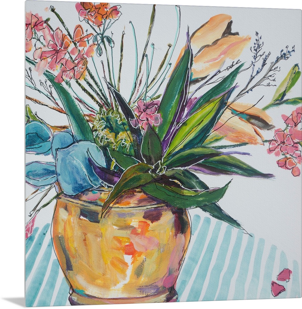 <p>Pen and wash illustration of a bright, cheerful, bowl of flowers on striped cloth.</p>