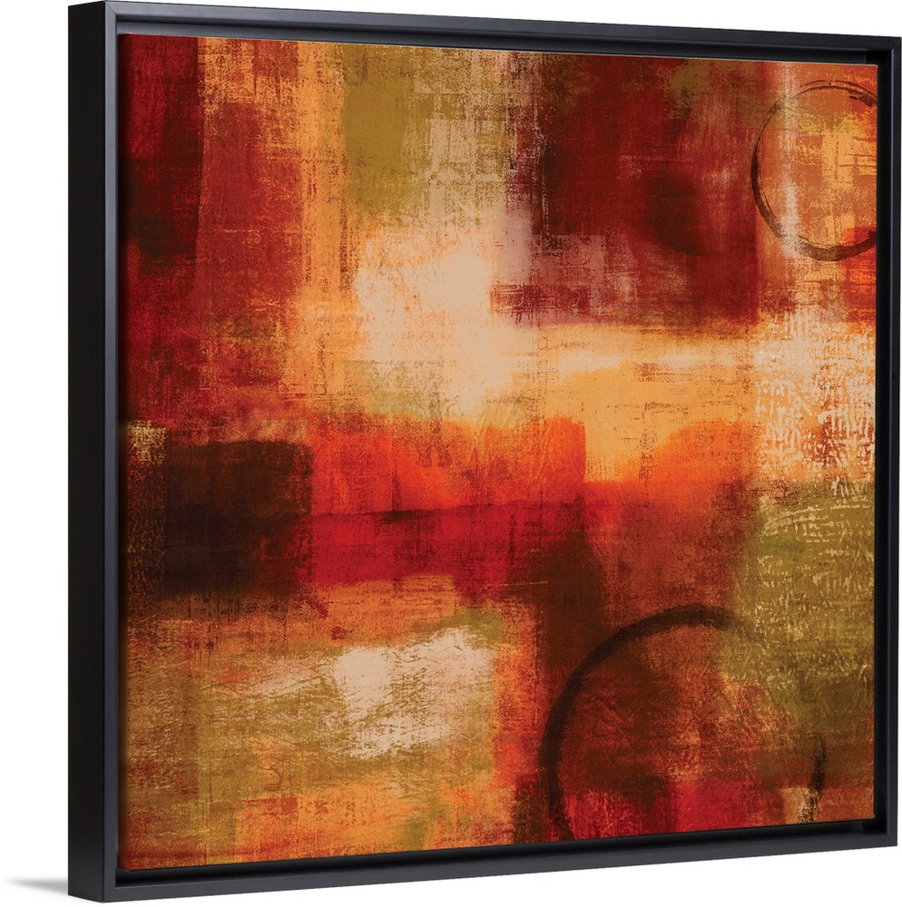 <p>Square abstract painting with warm splotches of color and two circular figures.</p>