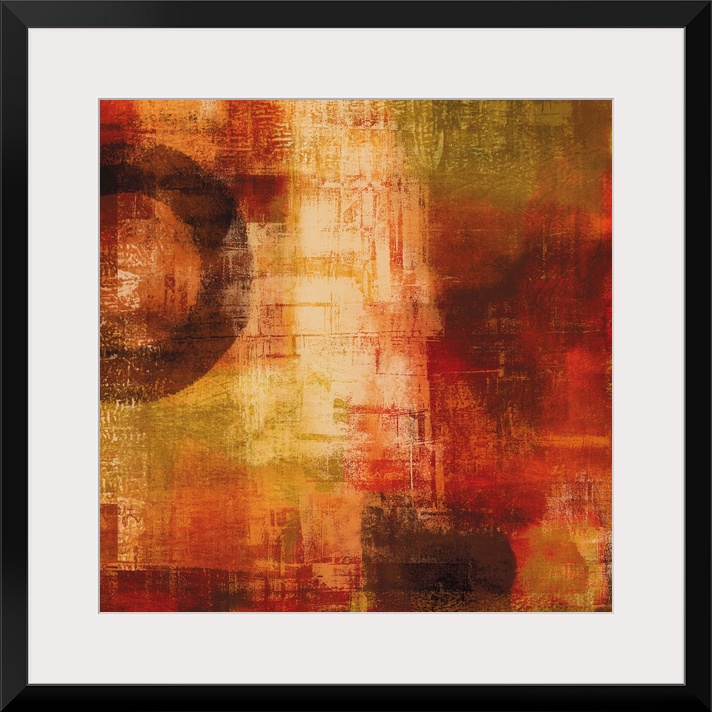 <p>Square abstract painting with warm splotches of color and one large circular figure on the side.</p>