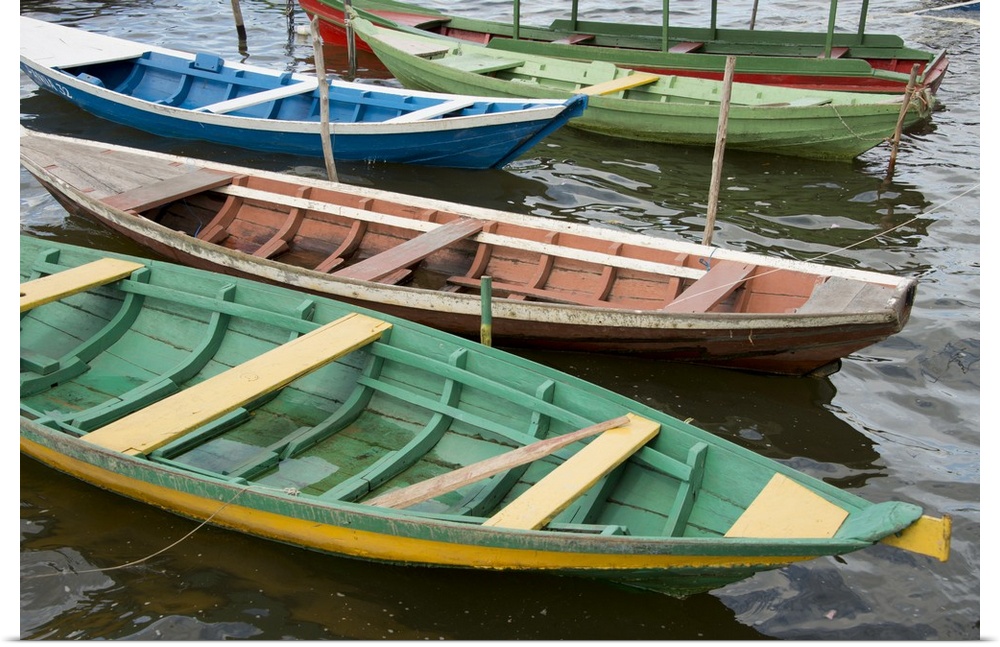 <p>Brazil, Amazon, Alter Do Chao, colorful local wooden fishing boats.</p>