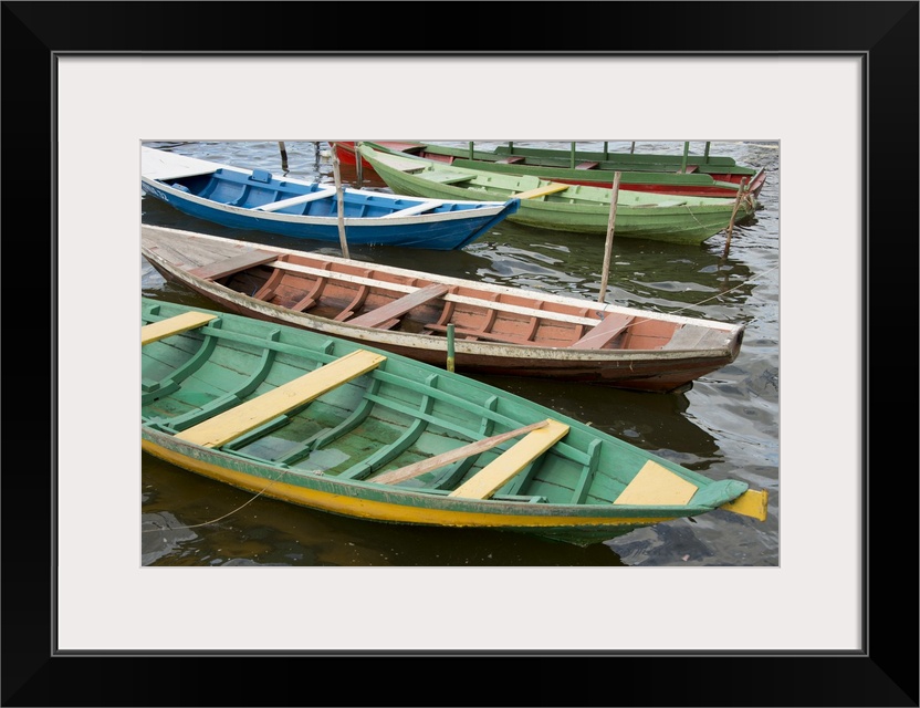 <p>Brazil, Amazon, Alter Do Chao, colorful local wooden fishing boats.</p>