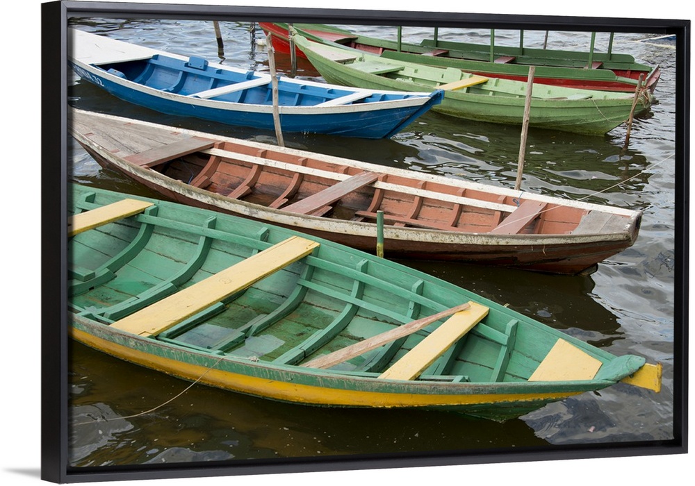 <p>Brazil, Amazon, Alter Do Chao, colorful local wooden fishing boats.</p>