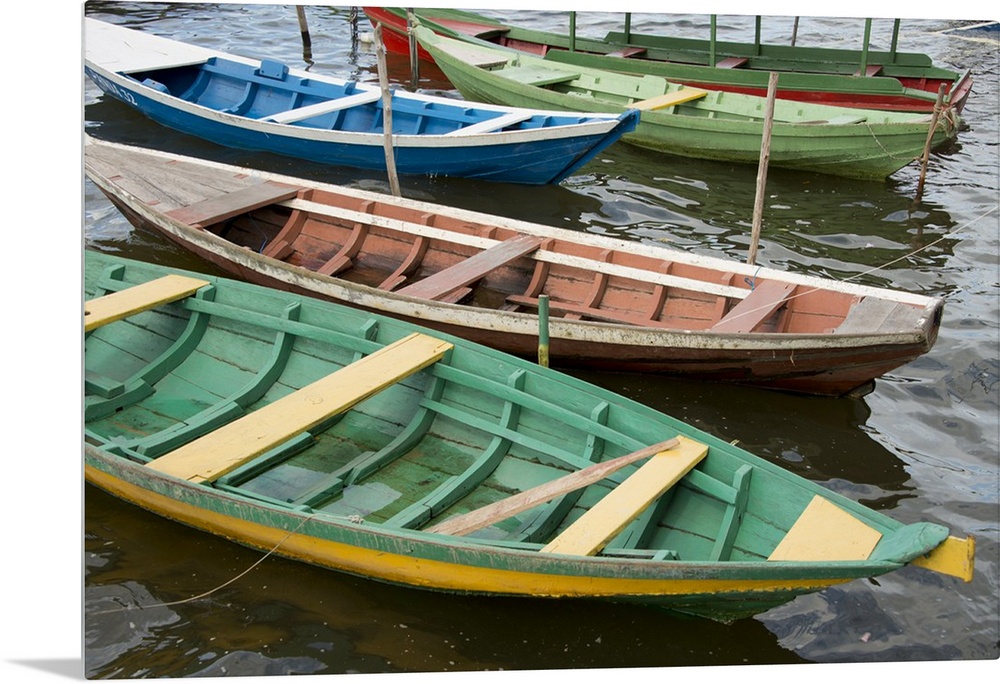 <p>Brazil, Amazon, Alter Do Chao, colorful local wooden fishing boats.</p>