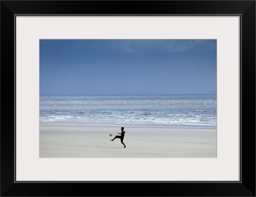 <p>South America, Brazil, Maranhao, Sao Luis, Sao Marcos beach, boy playing football on the beach</p>