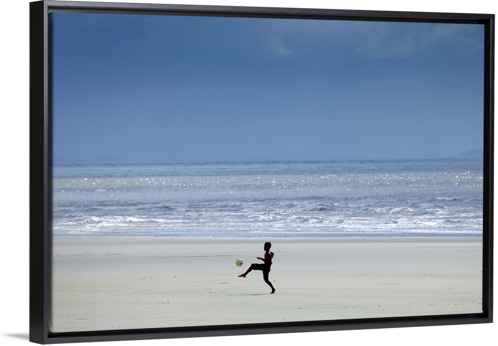 <p>South America, Brazil, Maranhao, Sao Luis, Sao Marcos beach, boy playing football on the beach</p>