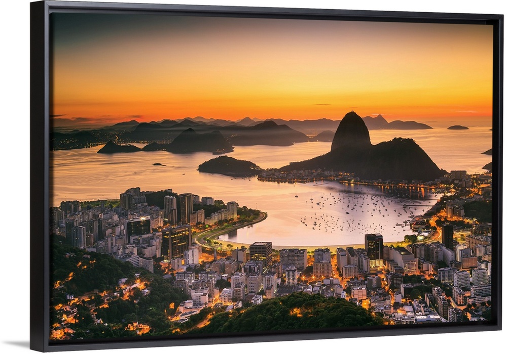 <p>Brazil, Rio de Janeiro, Sugarloaf Mountain, Baia de Guanabara, Flamengo, Botafogo and Sugarloaf Mountain at sunrise</p>