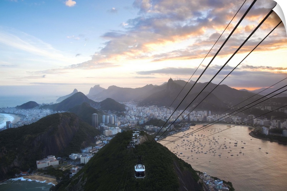 <p>Brazil, Rio De Janeiro, Urca, Cable Car on Sugar Loaf Mountain with view of Vermelha beach, Copacabana, Botafogo Bay and Chirst The Redeemer Statue atop Cocovado</p>