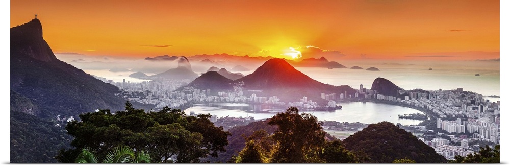 <p>Brazil, Rio de Janeiro, Corcovado, Christ the Redeemer, City at sunrise, Corcovado, Cristo Redentor, Sugarloaf Mountain, Lagoa Rodrigo de Freitas and Ipanema Beach, view from Foresta da Tijuca.</p>